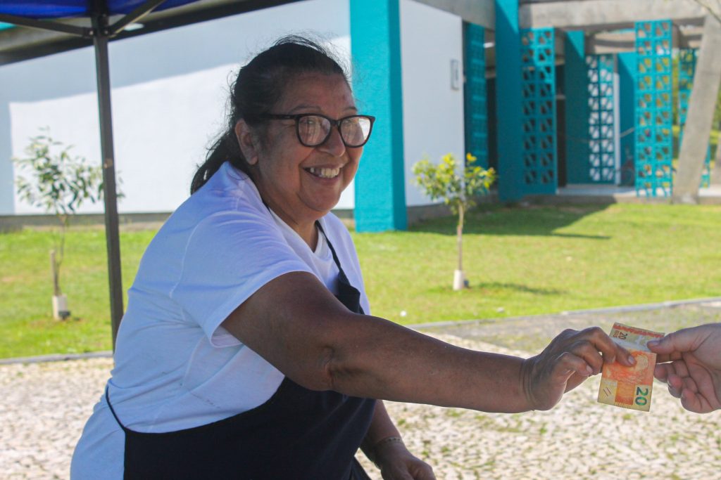 Enquanto o marido, Jacson, trabalha fora, Cintia cuida das crianças e organiza os produtos. Mesmo com a correria, ela vê os domingos na feira como um respiro. “Ficamos na rotina diária de segunda a segunda. Aqui, conheço outras mulheres, faço amizades e esqueço a rotina. É meu dia de folga” afirma.