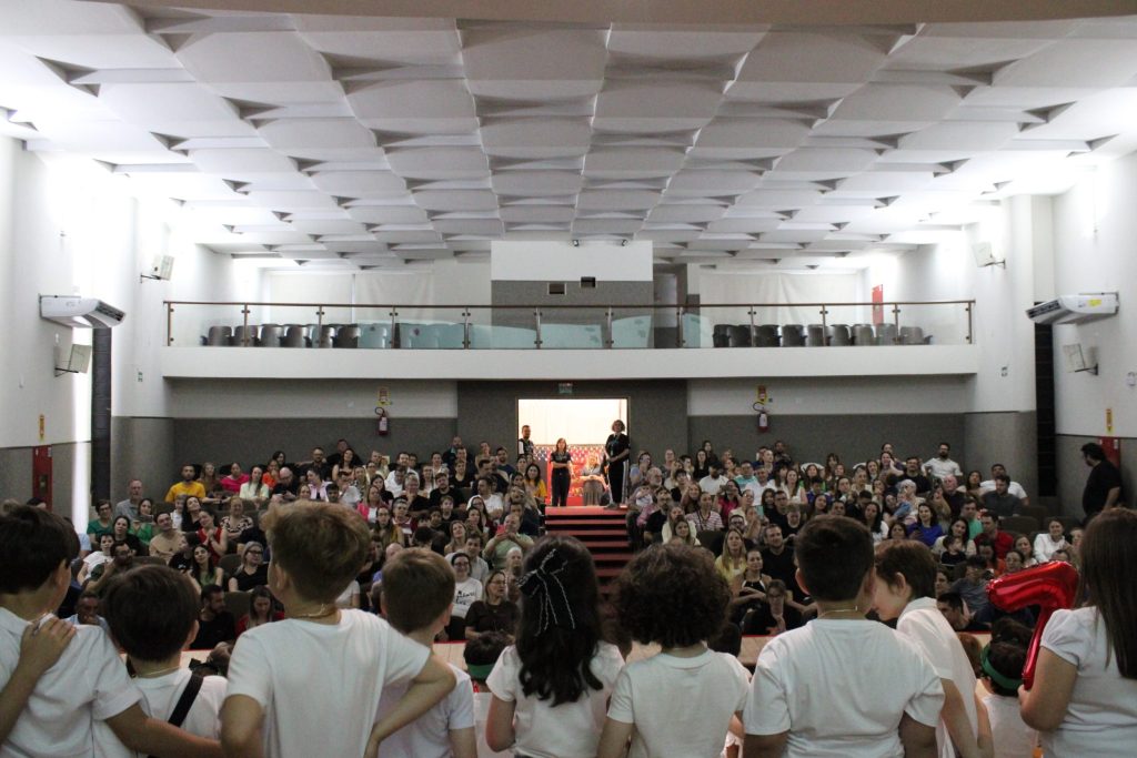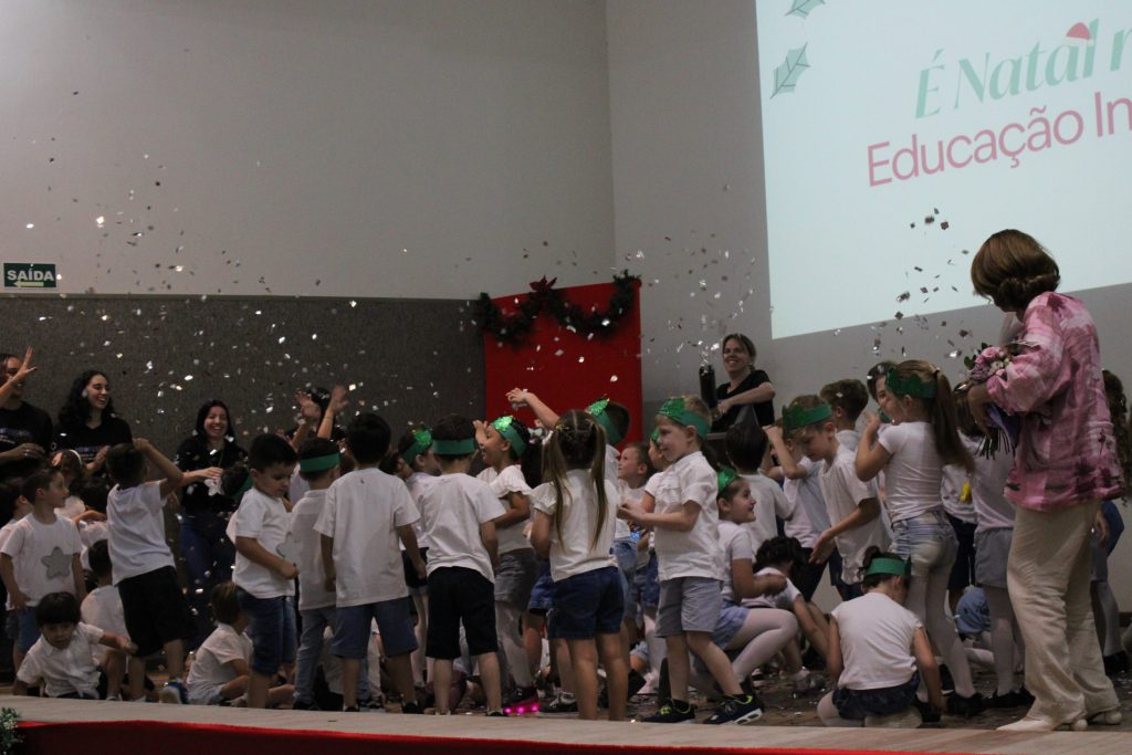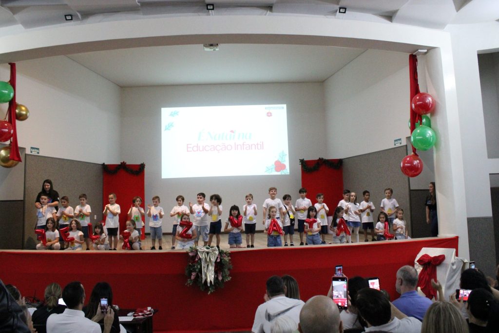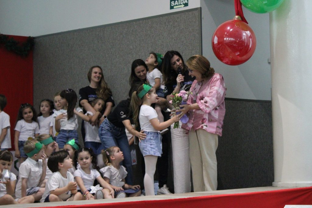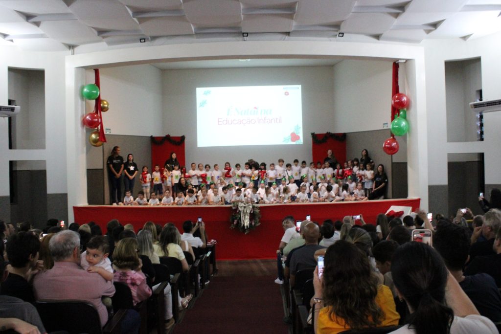Após as homenagens, as famílias acompanharam a apresentação de Natal preparada pelas quatro turmas da Educação Infantil. O clima natalino serviu de inspiração para a criação das coreografias temáticas.