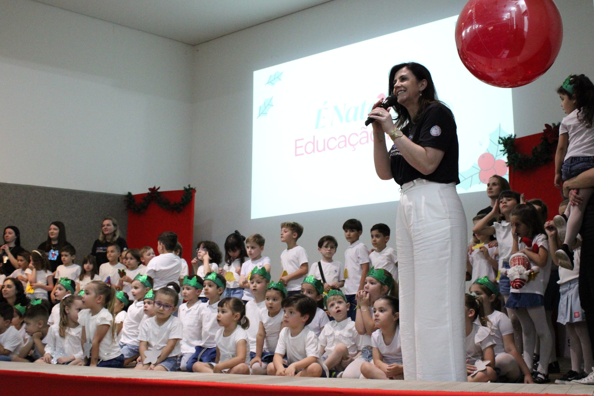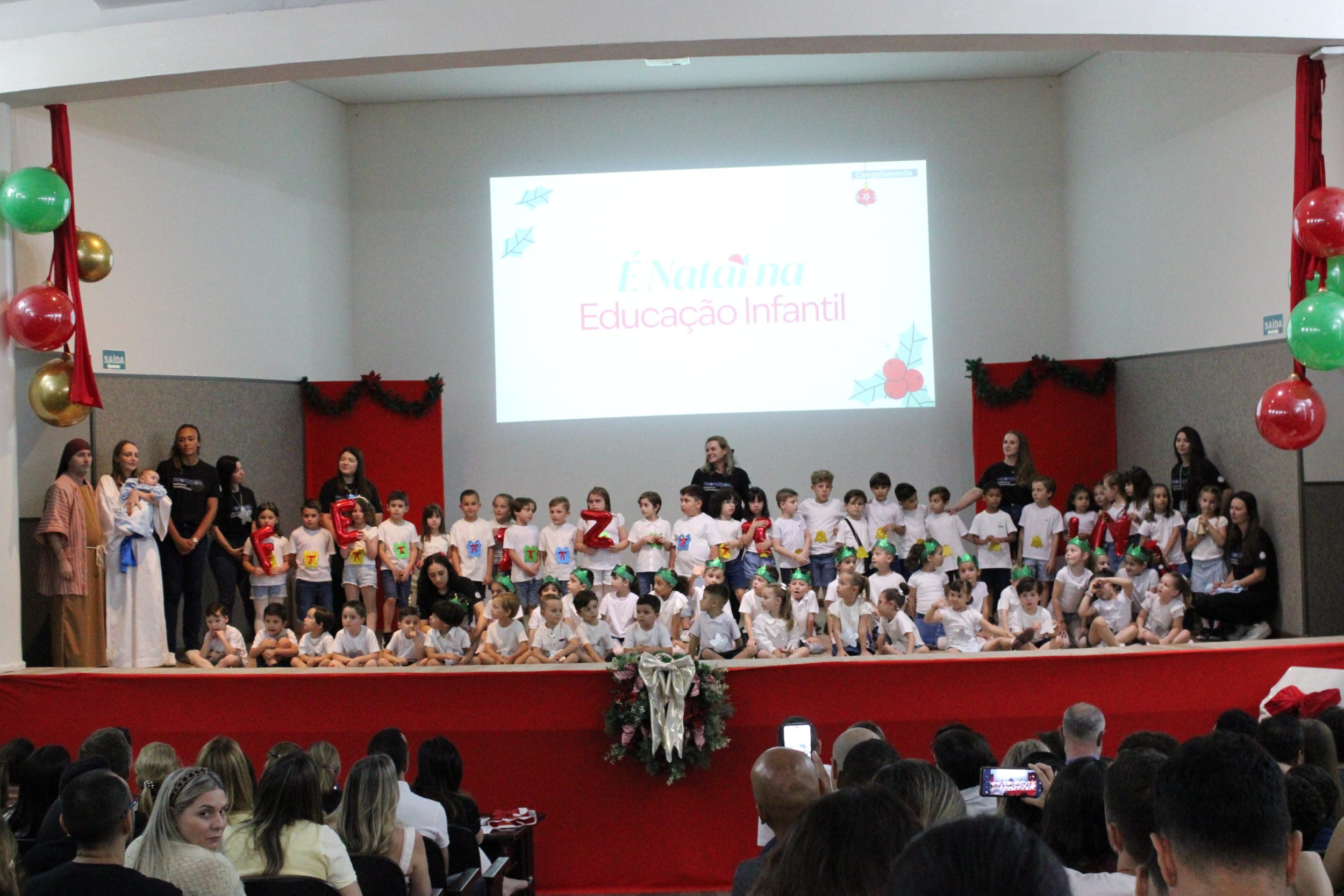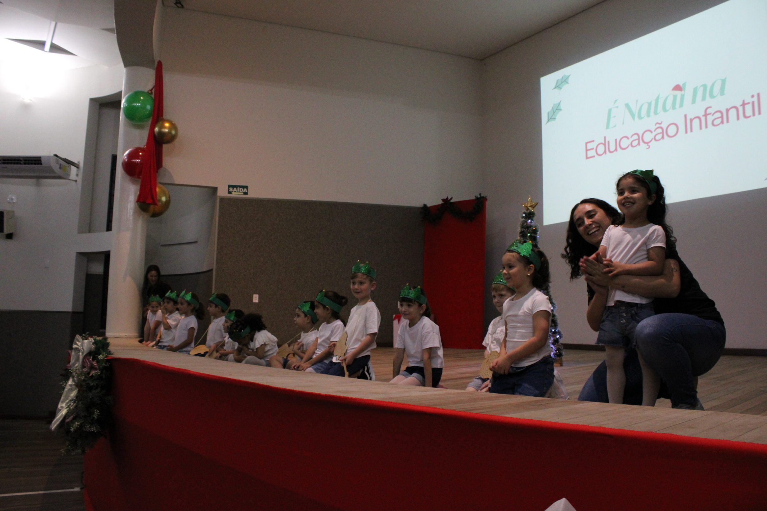 Após as homenagens, as famílias acompanharam a apresentação de Natal preparada pelas quatro turmas da Educação Infantil. O clima natalino serviu de inspiração para a criação das coreografias temáticas.