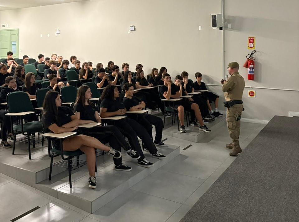 Alunos do 8º e 9º ano do Colégio SATC participaram de uma palestra sobre prevenção ao uso de substâncias. A atividade abordou conscientização, saúde e implicações legais relacionadas ao tema. Conduzido por um representante da Polícia Militar, o encontro priorizou diálogo e esclarecimento de dúvidas. A ação integra iniciativas educativas da escola para promover escolhas responsáveis entre os estudantes.